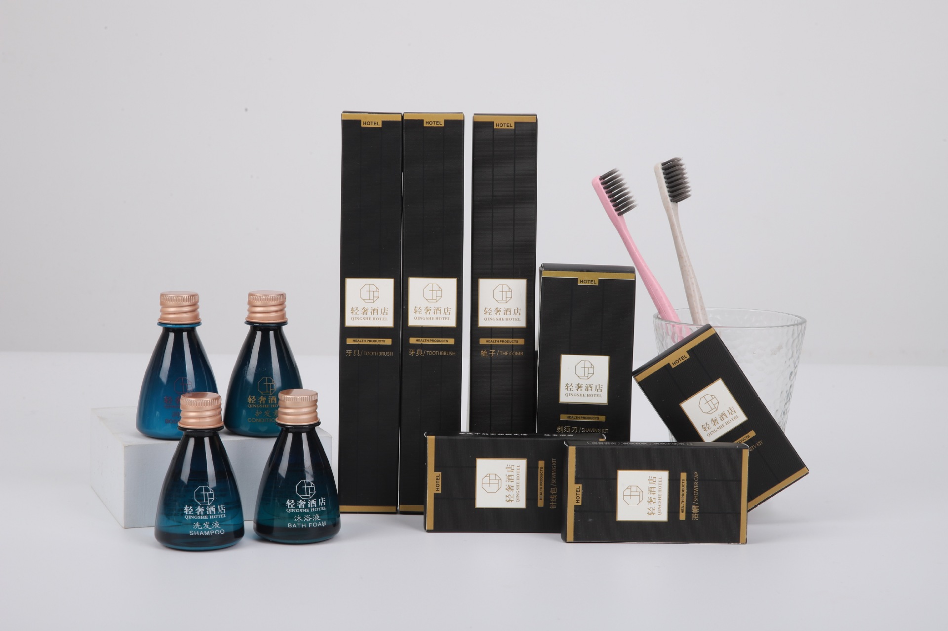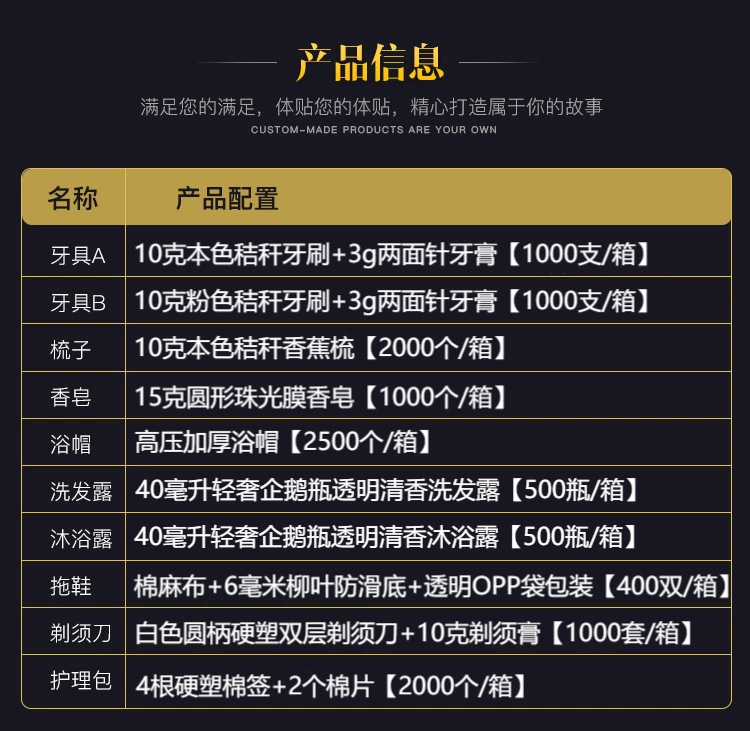 Toothbrush A | Toothbrush B | Comb | Shower cap | soap | Beard shaver | Care kit | shampoo | Body wash | Hair conditioner | Body lotion | Threads and Needles Pack